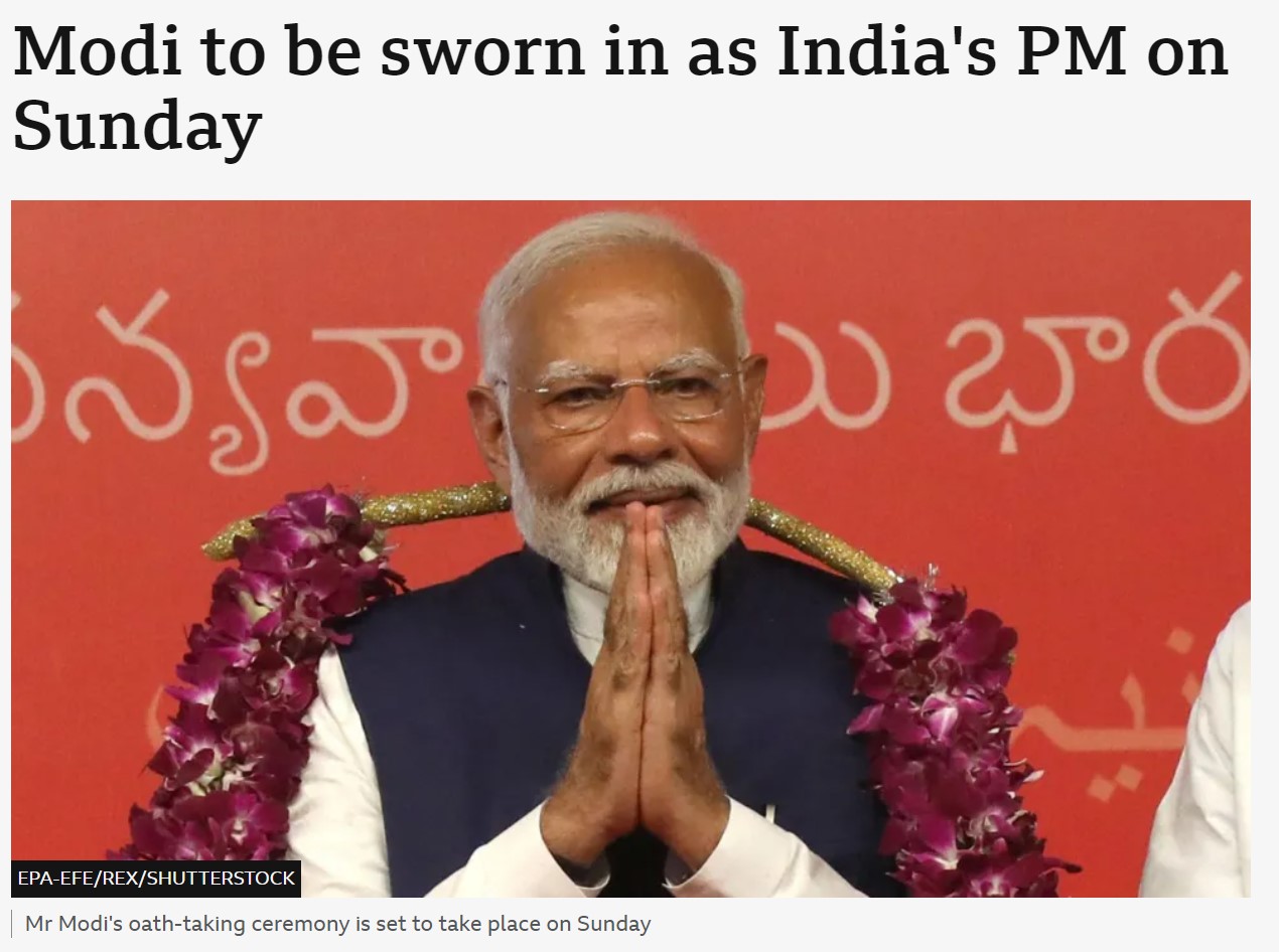 Narendra Modi, leader of the Bharatiya Janata Party (BJP), is set to be sworn in as India’s prime minister for a third term on Sunday, marking a record-equalling achievement. The ceremony is scheduled for 6 pm local time (12:30 GMT), according to a senior party leader.